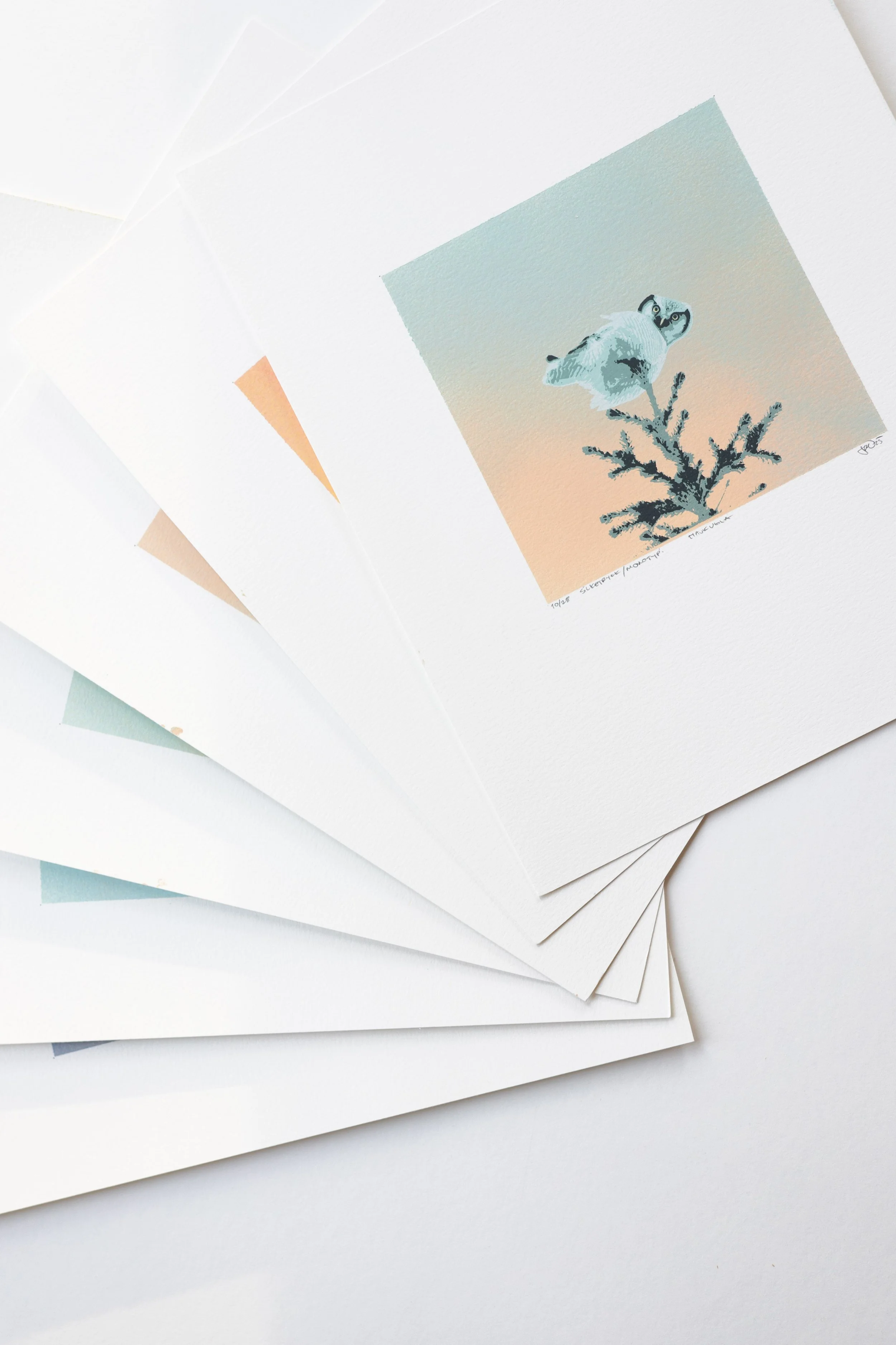Monotypier er en prosess der hvert enkelt trykk blir unikt. Selve motivet er likt for hver serie, men hver enkelt bakgrunn males enkeltvis før trykkingen starter.